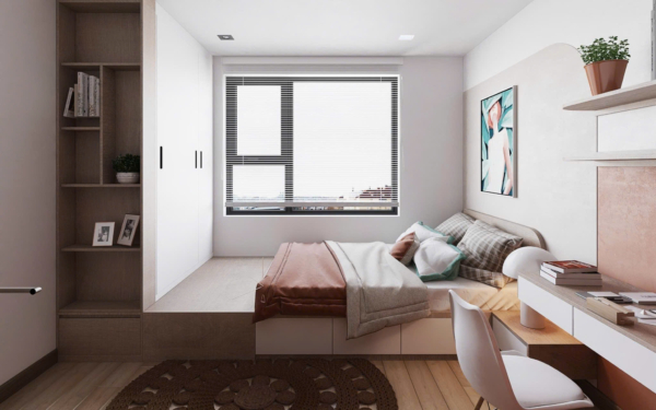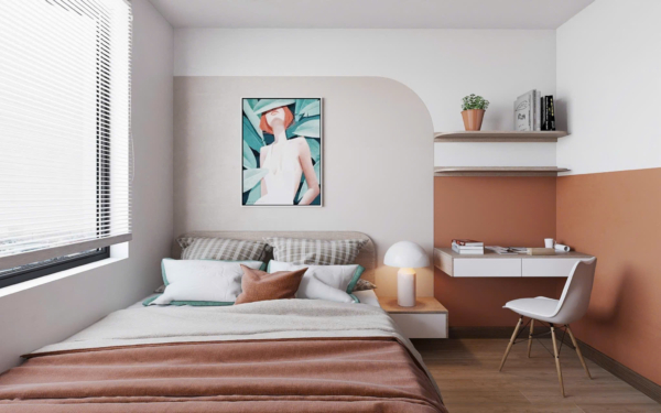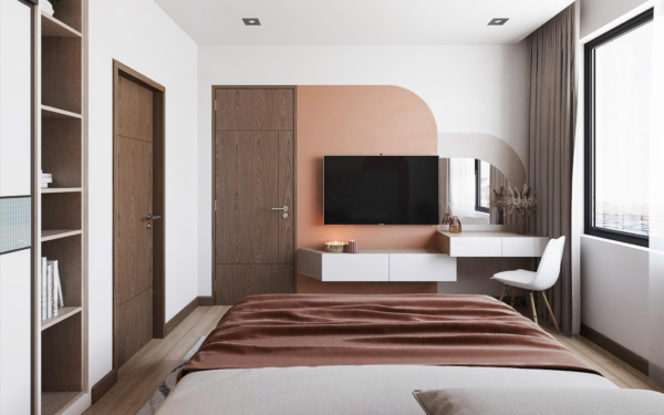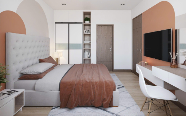Ba phòng ngủ mang hai sắc thái riêng biệt nhưng vẫn giữ sự đồng nhất với tổng thể. Phòng ngủ chính sử dụng tone nâu cam trầm ấm, nội thất tinh gọn giúp tạo chiều sâu và sự yên tĩnh. Phòng ngủ phụ được phối xám nhạt – trắng, phù hợp cho trẻ nhỏ hoặc làm phòng làm việc tiện nghi.