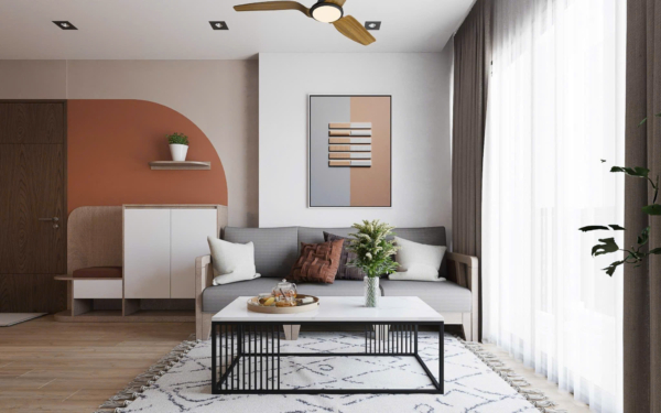Phòng khách được bố trí mở, liền kề khu bếp, sử dụng nội thất tối giản với sofa xám trung tính và điểm nhấn là các chi tiết gỗ nâu cam nổi bật. Không gian thoáng đãng, tràn ngập ánh sáng tự nhiên nhờ hệ cửa kính lớn, mang lại cảm giác dễ chịu và thư giãn mỗi khi trở về nhà.